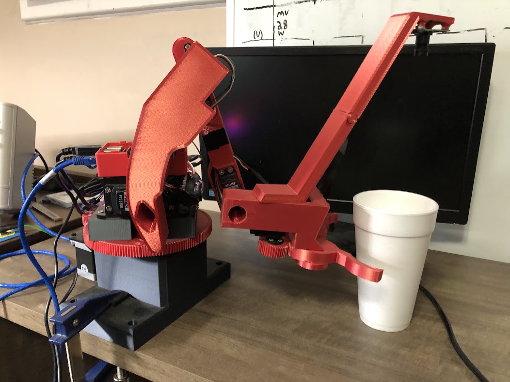 Visual servoing with a homemade robotic arm designed, engineered, and built by Erik Sarkinen. The arm finds the cup with a camera, so the arm operates automatically. The camera feed is shown on the monitor.Custom Android tablet application for initiating the visual servoing or controlling the robotic arm. The app communicates with the Raspberry Pi, the Linux computer on the robot, via Bluetooth.Custom printed circuit board I designed in Altium Designer and had printed overseas. Two dsPIC33E motor controller microcontrollers were used.Raspberry Pi camera stream. The white circle is the cup being grasped.Stepper motor for rotation and custom 3D printed gears I made.FEETECH servo motors I used. The green wire is potentiometer feedback giving the angle of the motor shaft.Raspberry PI (64-bit Linux mini-computer) used to control the arm and do the video processing.CAD model of the robotic arm. Every part was modeled and printed by me except the motors.Mechanical claw CAD model designed and 3D printed by me.